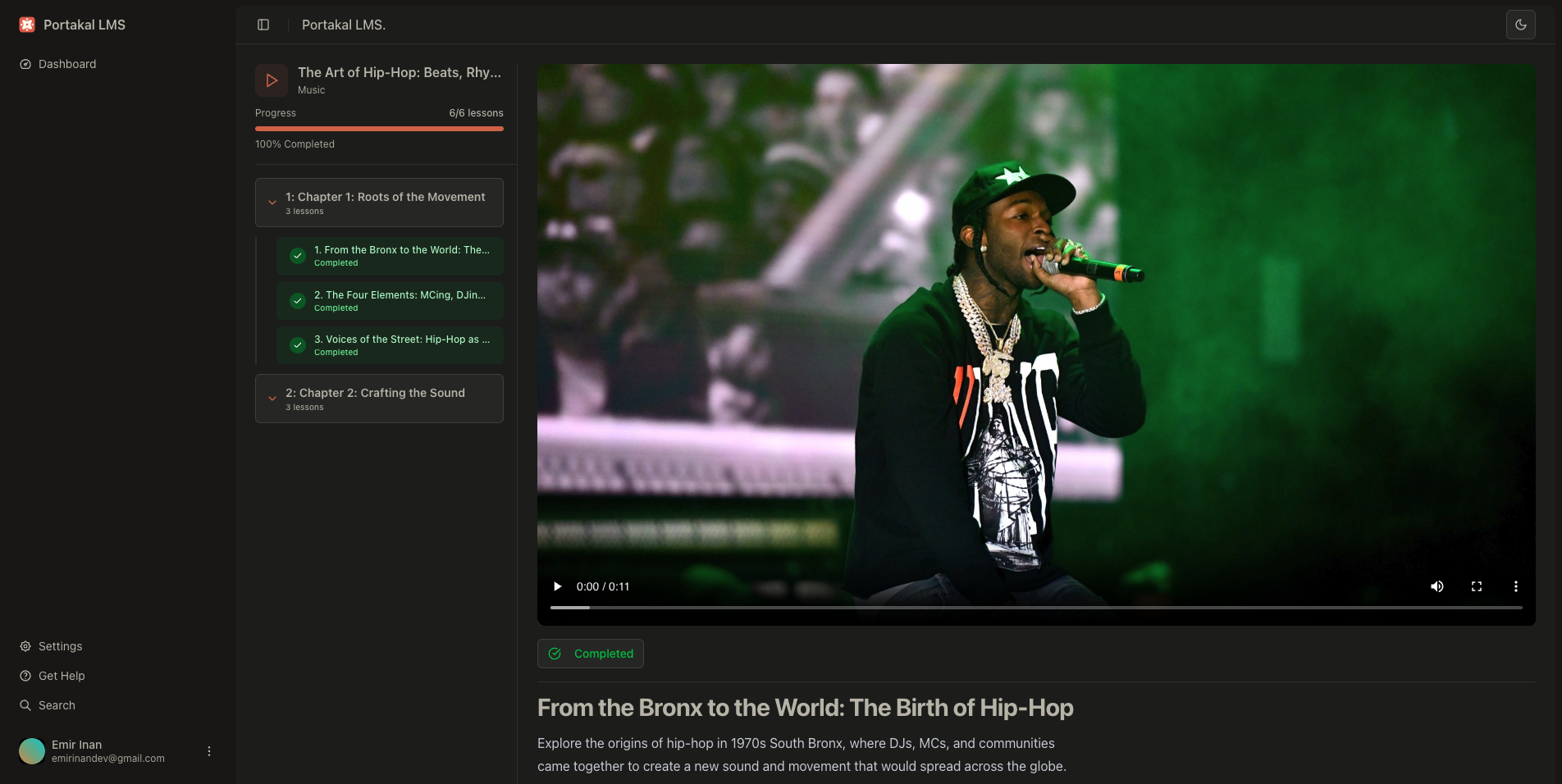 Portakal uses Stripe for course purchases, which means enrollment is tied directly to a real transaction flow. That turns the platform into something closer to a small SaaS product than a static prototype. A course can be published, purchased, and then appear inside the student experience in a way that feels connected end to end.
